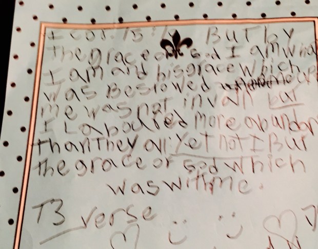 The verse was First Corinthians 15:10, which says, “But by the grace of God I am what I am: and his grace which was bestowed upon me was not in vain; but I laboured more abundantly than they all: yet not I, but the grace of God which was with me.”