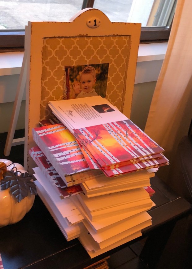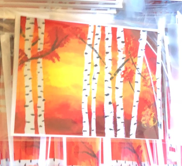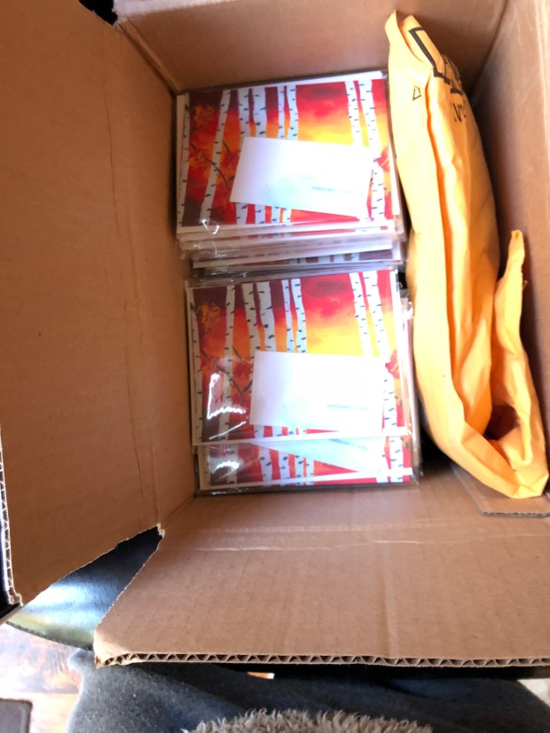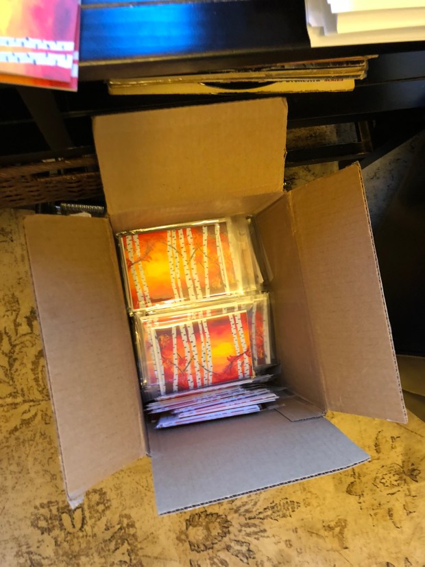 I had sent them some card samples in February. I heard back from them a couple of weeks later and they loved the Aspen Sunset card. I was so excited to have this opportunity again with God’s Glory Box. But the excitement is wearing off just a tad. I have been folding and packing cards and envelopes for about a month. I got the cards, envelopes and the blessed clear bags on September 20th and got right to work the next day!