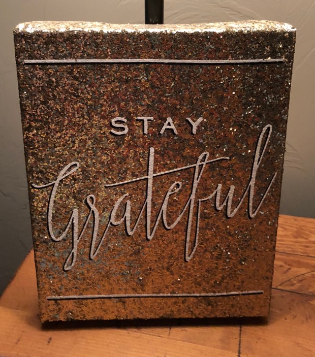 Every day I wake up and see this gold-sequined sign that one of my friends gave me. The sign says, “Stay grateful” in cute lettering. I have it on my dresser amongst a lamp, jewelry box, picture frames, a clock that needs batteries, other smaller signs and a pink box that has cards people have given me over the years. It’s somewhat organized to say the least. But, every morning when I wake up I glance at the stay-grateful sign and sometimes think, “Why must I be grateful today? I’m probably going to be tighter because a cold front is coming through.” But I can get out of bed by myself and make coffee and stay home by myself while my parents are at work. I’m thankful that I’m able to do all these tasks. But it can also be frustrating when the weather gets colder and I have to wear more layers to stay warm.